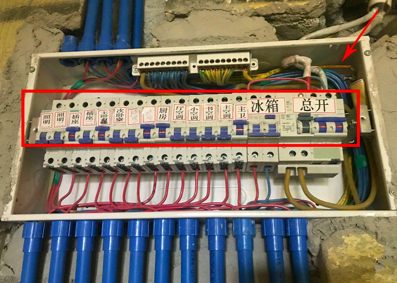首先是这个强电箱,里面的每一个回路都贴了标签,每一根电线都表明了关联的电器,避免了接错线,后期也好操作~